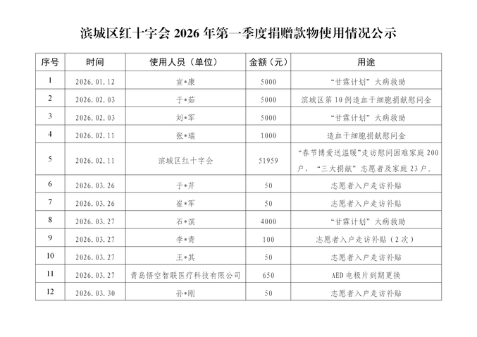 滨城区红十字会2026年第一季度捐赠款物使用情况公示